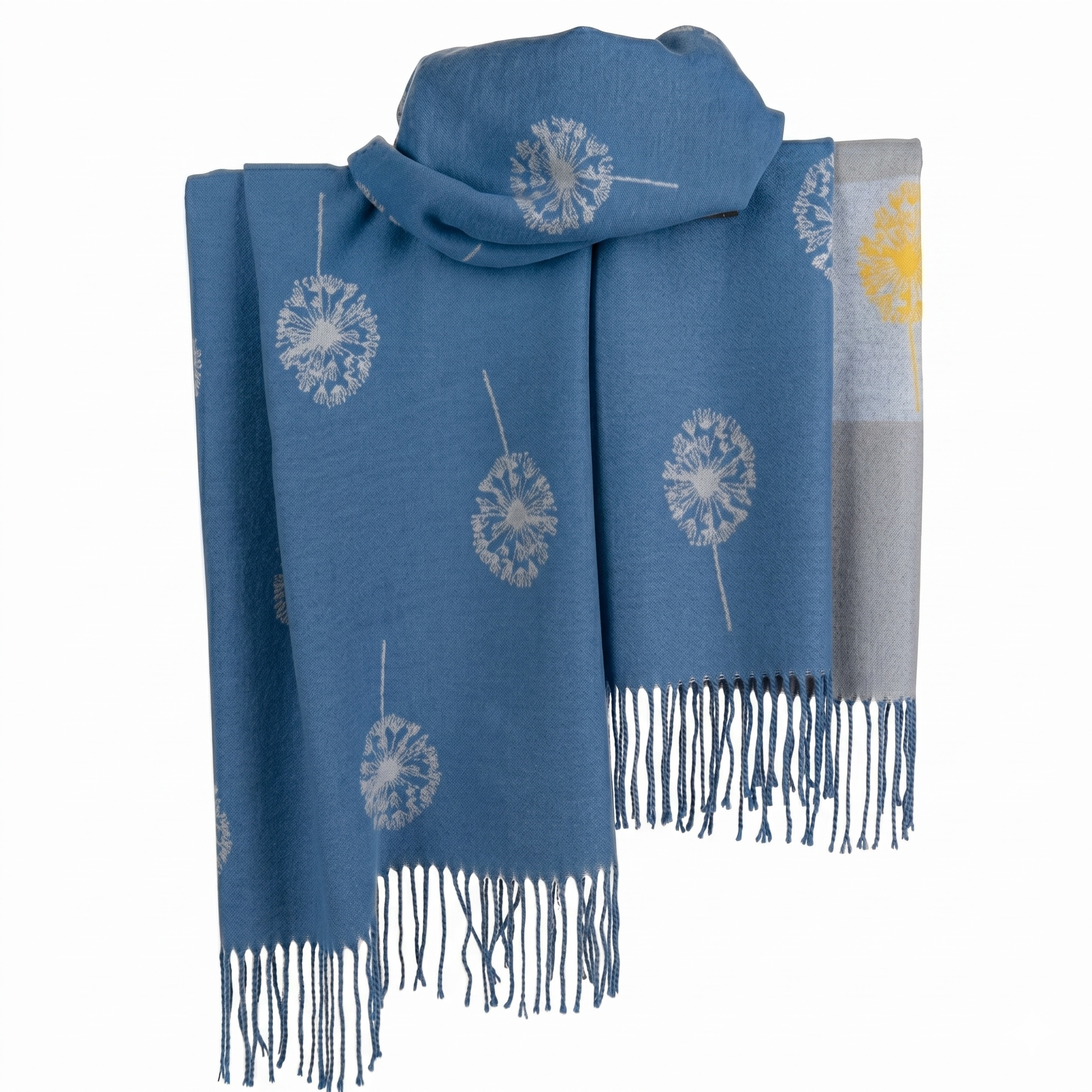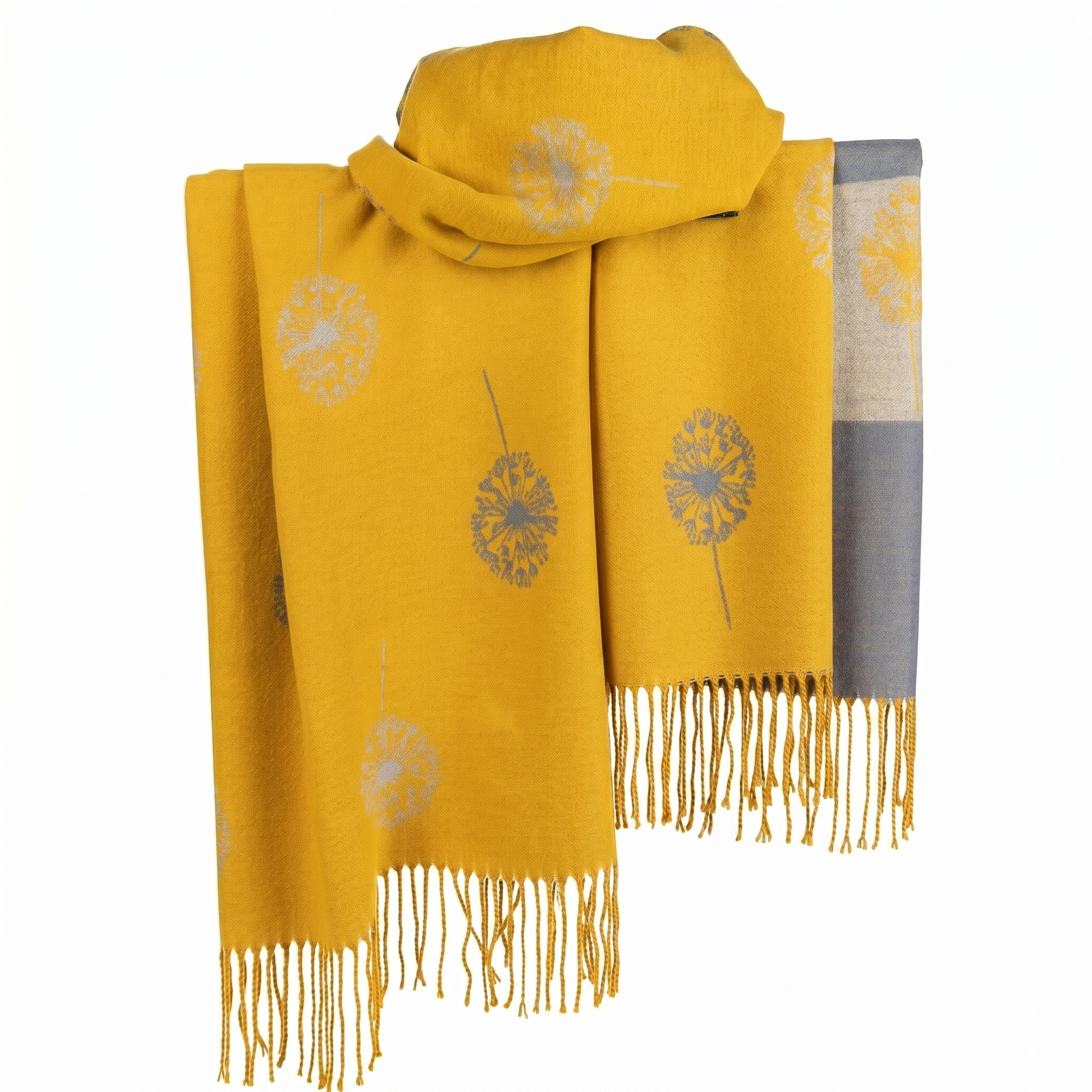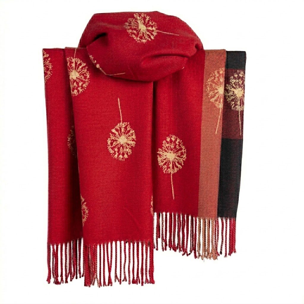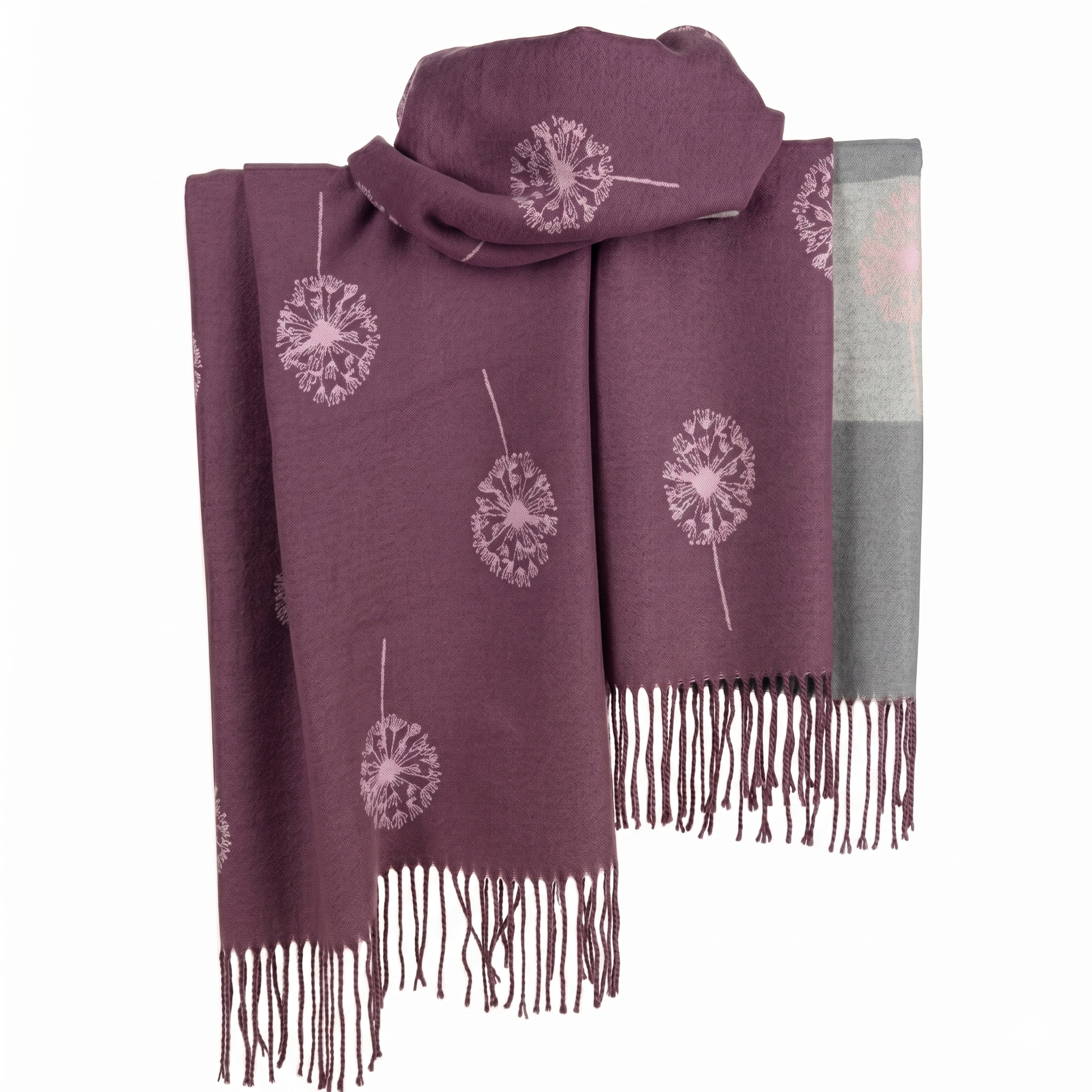A luxuriously soft, oversized wrap featuring a delicate dandelion seed head pattern and elegant fringe detailing. This versatile accessory provides lightweight warmth and a sophisticated finish to any outfit.