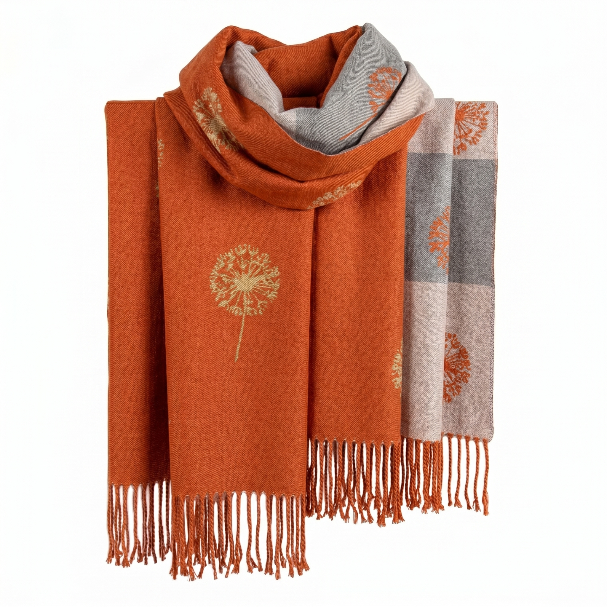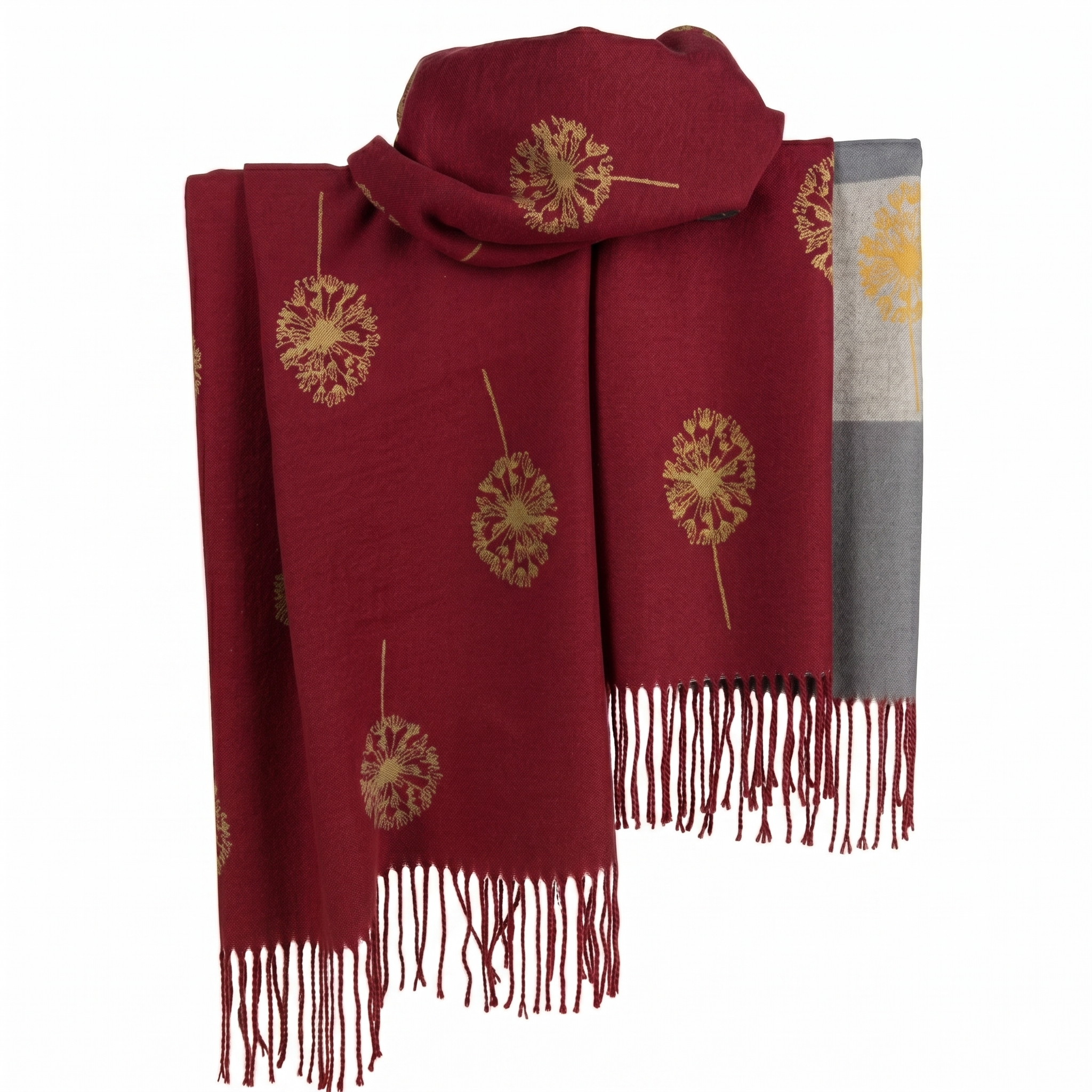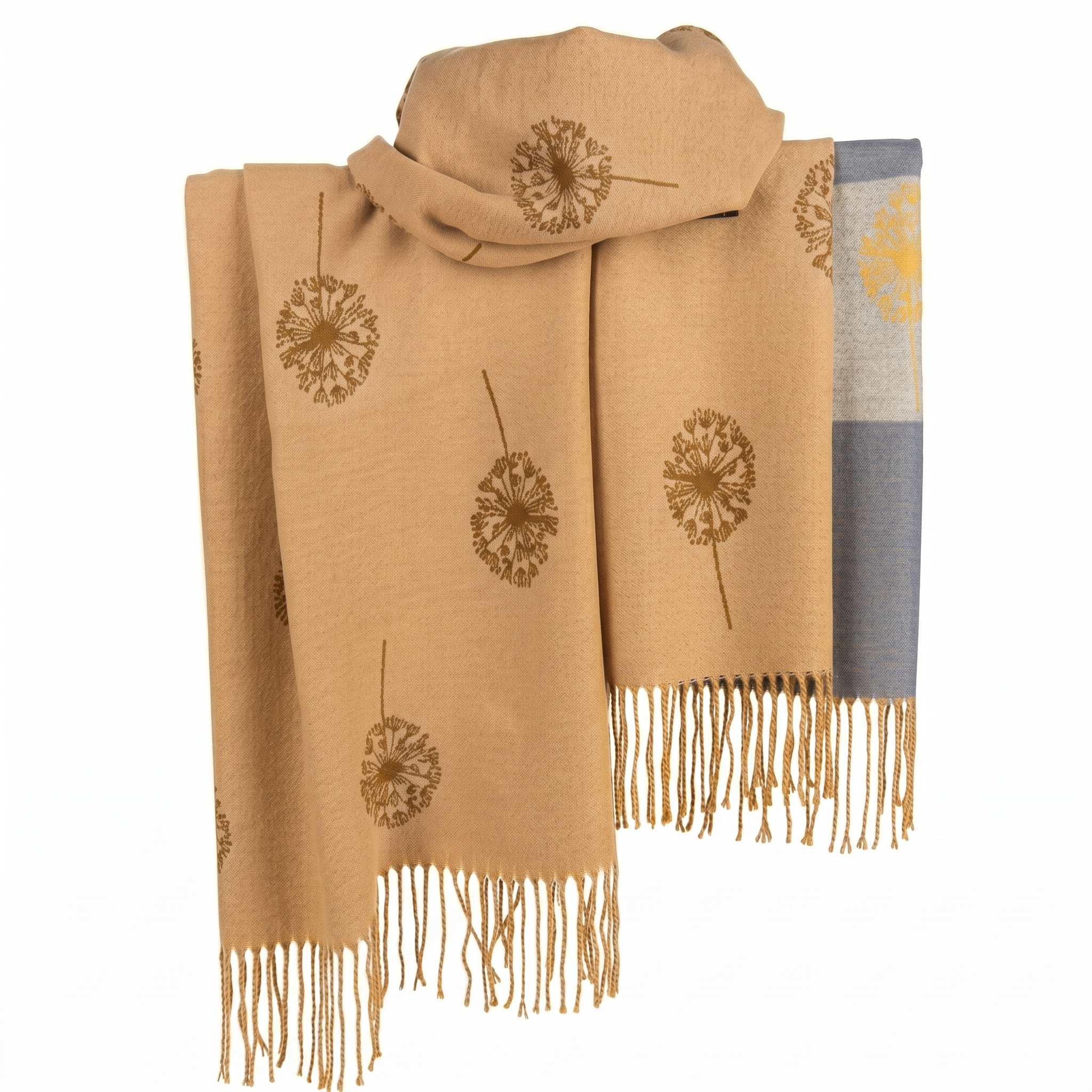 A luxuriously soft, oversized wrap featuring a delicate dandelion seed head pattern and elegant fringe detailing. This versatile accessory provides lightweight warmth and a sophisticated finish to any outfit.